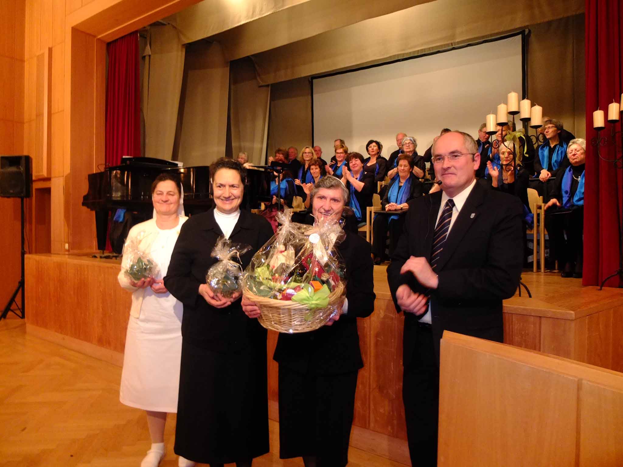 Ebenfalls geehrt wurden die Franziskanerschwestern des Marienheimes für ihre aufopfernde und liebevolle Pflege, die sie alten, kranken und gebrechlichen Menschen im Marienheim angedeihen lassen. Seit 1965 seien die Franziskanerschwestern aus Split eine verlässliche Stütze der Bewohner, Angehörigen und Mitarbeiter, für ihre Verbundenheit zum Marienheim, ihre liebevollen Dienste und die vielen geleisteten Stunden und Überstunden an tätiger Nächstenliebe dankte Josef Oswald mit Geschenkkörben und Medaille: Schwester Lujza (Oberin), Schwester Sylvana, Schwester Nada und Schwester Vesna stellvertretend für den Orden und die Mitschwestern.
