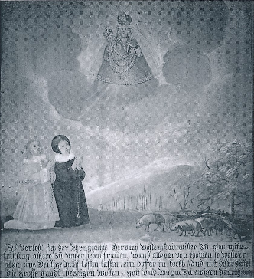 Auf dem Bild sehen wir die knienden Steinmüllers in zeitgenössischer Tracht. Die Rosenkränze sind sicher zu groß dargestellt, aber kleiner war es auf dem Bild schlecht möglich. Die abgebildete Schweineherde soll sicher nicht die „Frischlinge” darstellen, sondern gewissermaßen das „ausgewachsene Endergebnis”, um das man ja gebangt und weswegen man sich verlobt hatte. Die Bäume am rechten Bildrand dürften Eichen sein, denn deren Früchte waren eine Futterbasis für die damalige Schweinemast (Dechelmast).
